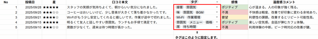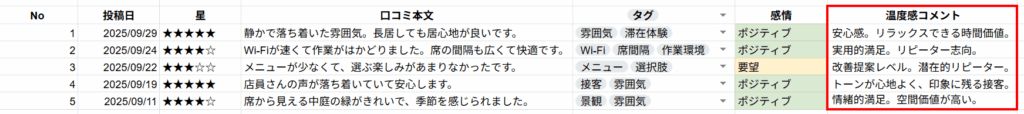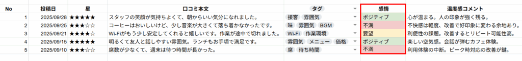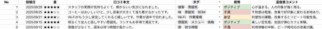 このあたりをスプレッドシートの見出しにしておくと、新しい口コミを追加するたびに全体の傾向がすぐに見えてきます。